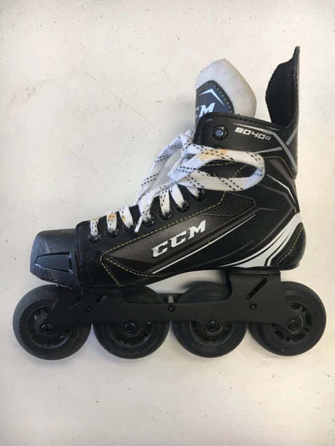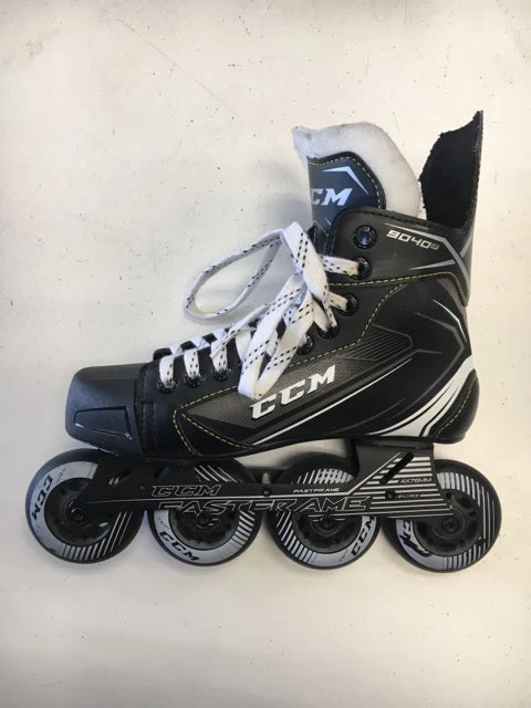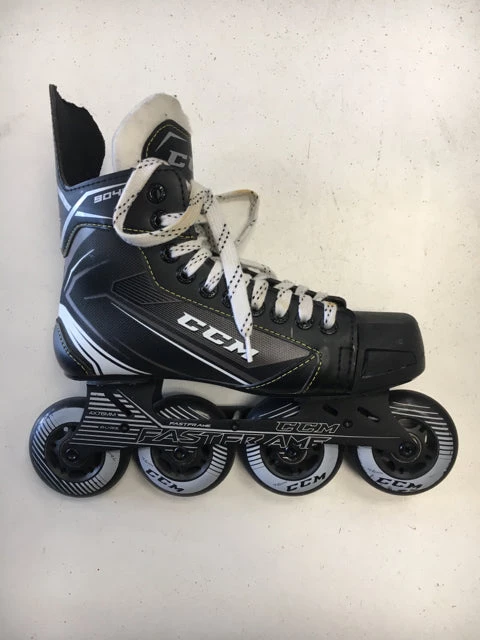 CCM Used Tacks 9040 Int. Size 5 Roller Hockey Skates. Some ware and staining on boots and laces. Wheels and chassis in fair condition.