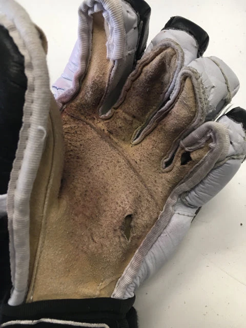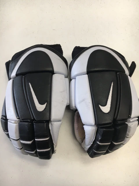 Used Nike Black/White JR Size 10″/11″ Hockey Gloves. Some ware on left palm. Fingers and padding in good condition.