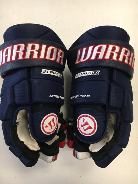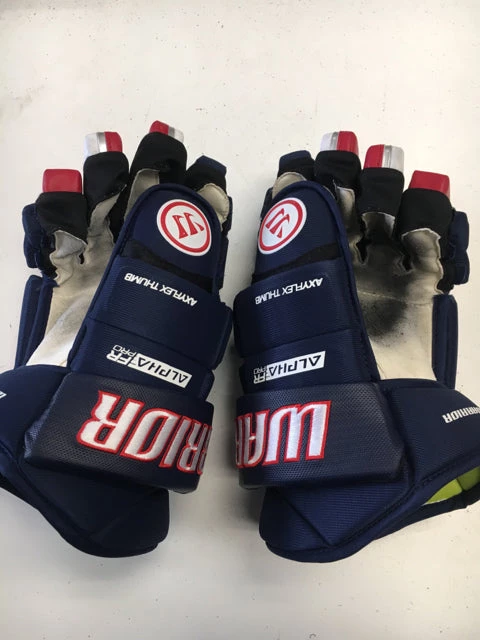 Used Warrior Alpha FR Pro Red/White/Blue Sr Size 14″ Hockey Gloves. Some ware on gloves.