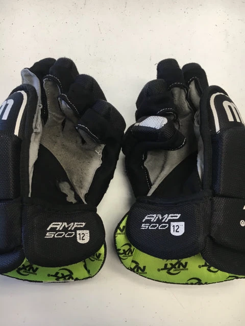 Winnwell Used AMP 500 Black Size 12″ Hockey Gloves. Some ware on palms of gloves. overall in good condition.